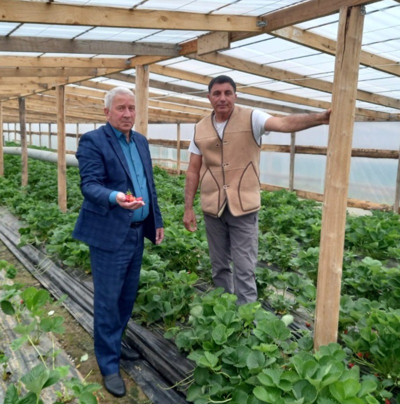 Руководитель муниципалитета Борис Будаев хорошо знает, как нелегко выращивать сельскохозяйственную продукцию, да ещё не в благоприятных климатических условиях. Именно затяжная весна, ветер, холодная погода этой весной значительно ухудшили ранние урожаи растениеводов. Посетив хозяйство Сафара Байрамова, глава района отметил, что, несмотря на все трудности, новый урожай сортовой клубники в его хозяйстве составил 1 тонну. Получать раннюю и позднюю (до самых заморозков) вкусную ягоду индивидуальному предпринимателю удается благодаря ее выращиванию в тепличных условиях.