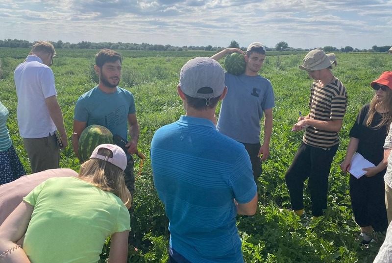 Продолжилось знакомство ребят с сельхозпроизводителями Енотаевского района в КФХ Камила Мамедова. На территории Средневолжского сельсовета развернулось растениеводческое хозяйство предпринимателя. Камил Мамедов выращивает на 42 га — сладкий болгарский перец и на 3 га — бахчевые культуры. На бахче Камил Мамедов рассказал студентам о том, как определить спелость астраханской ягоды, как выбрать сладкий и сочный арбуз и о том, как в минувшем году он стал участником межрегионального конкурса и стал победителем в номинации «Самый большой арбуз».