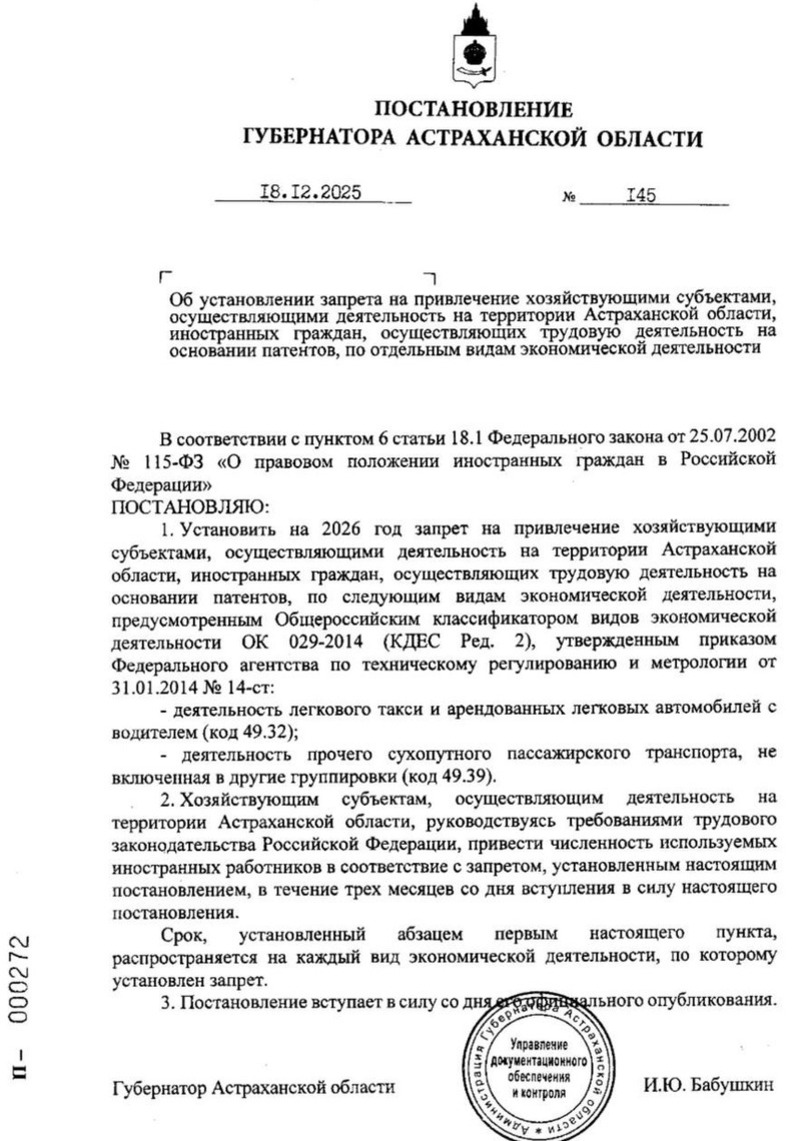 Соответствующее постановление подписано губернатором Астраханской области. Согласно документу, в 2026 году нельзя будет привлекать к работе в такси, автобусах и маршрутках иностранцев, которые имеют трудовые патенты. Помимо этого, работодатели региона должны привести численность зарубежных сотрудников в соответствие с законом.